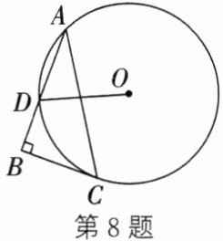 8. 如图,在△ABC中,∠B=90°,⊙O过点A、C,与AB交于点D,与BC相切于点C.若∠A=32°,则∠ADO的度数为.