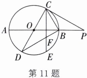 11. (2023·济南)如图,AB、CD为⊙O的直径,C为⊙O上一点,过点C的切线与AB的延长线交于点P,∠ABC=2∠BCP,E是$\overset{\frown}{BD}$的中点,弦CE与BD相交于点F.