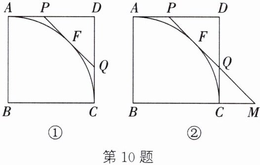 10. 如图①,在边长为4的正方形ABCD中,以点B为圆心,BA为半径作$\overset{\frown}{AC}$,F为$\overset{\frown}{AC}$上一动点,过点F作$\overset{\frown}{AC}$所在圆的切线,交AD于点P,交CD于点Q.