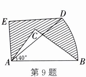 9. (整体思想)如图, 在 $\triangle ABC$ 中, $AB = 5$, $AC = 3$, $BC = 4$, 将 $\triangle ABC$ 绕点 $A$ 按逆时针方向旋转 $40^{\circ}$ 得到 $\triangle ADE$, 点 $B$ 经过的路径为 $\overset{\frown}{BD}$, 则图中阴影部分的面积为.