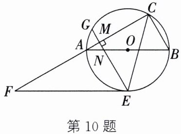 10. 如图, $\triangle ABC$ 内接于 $\odot O$, $AB$ 是 $\odot O$ 的直径, $CE$ 平分 $\angle ACB$, 交 $\odot O$ 于点 $E$, 过点 $E$ 作 $EF // AB$, 交 $CA$ 的延长线于点 $F$.