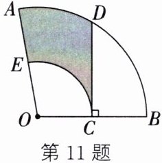 11. 如图, 在扇形 $OAB$ 中, $\angle AOB = 100^{\circ}$, $OA = 12$, $C$ 是 $OB$ 的中点, $CD \perp OB$ 于点 $C$, 交 $\overset{\frown}{AB}$ 于点 $D$, 以 $OC$ 为半径的 $\overset{\frown}{CE}$ 交 $OA$ 于点 $E$. 求图中涂色部分的面积.