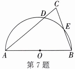 7. (2024·广安)如图, 在 $\triangle ABC$ 中, $AB = AC = 10$, $\angle C = 70^{\circ}$, 以 $AB$ 为直径作半圆 $O$, 与 $AC$、$BC$ 分别相交于点 $D$、$E$, 则 $\overset{\frown}{DE}$ 的长为.