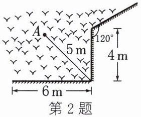 2. (新情境·现实生活)如图,一根$5\mathrm{m}$长的绳子,一端拴在围墙墙角的柱子上,另一端拴着一只小羊$A$(小羊只能在草地上活动),那么小羊$A$在草地上的最大活动区域的面积是 ()