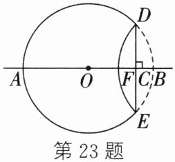 23. (分类讨论思想)(2024·江西)如图,AB是⊙O的直径,AB=2,点C在线段AB上运动,过点C的弦DE⊥AB,将$\overset{\frown}{DBE}$沿DE翻折交直线AB于点F.当DE的长为正整数时,线段FB的长为.