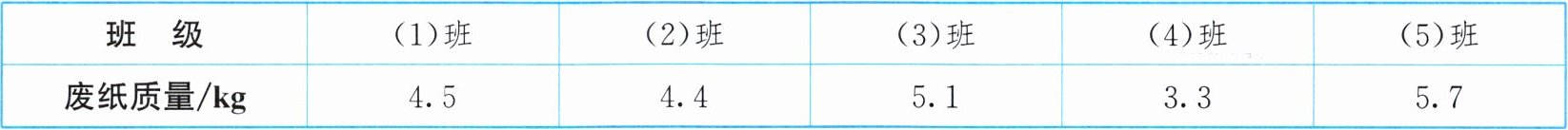 1. (新情境·生态环境)为增强学生的环保意识,共建绿色文明校园,某学校组织“废纸宝宝旅行记”活动.经统计,九年级5个班级一周回收废纸情况如下表: