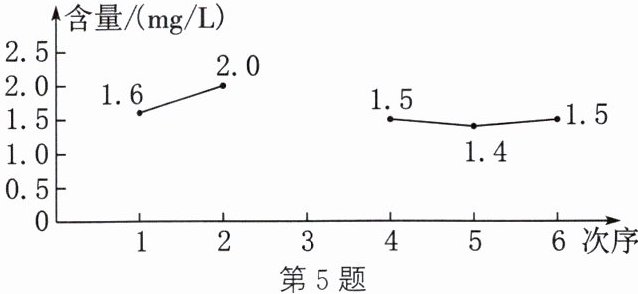 5. 为监测某河道水质,进行了6次水质检测,绘制了如图所示的氨氮含量的折线统计图.若这6次水质检测氨氮含量的平均数为1.5 mg/L,则第3次检测得到的氨氮含量是mg/L.