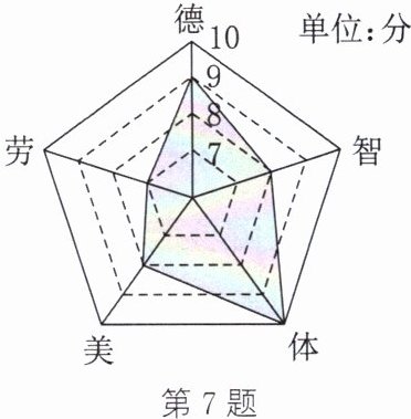 7. 为深入落实“立德树人”的根本任务,坚持德、智、体、美、劳全面发展,某学校积极推进学生综合素质评价改革.某同学在本学期德、智、体、美、劳的评价得分如图所示,则该同学五项评价得分的平均数为()