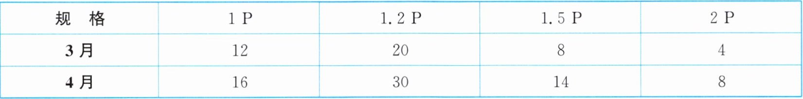 9. 某商店3、4月同一种品牌各种规格的空调的销售数量(单位:台)统计如下表: