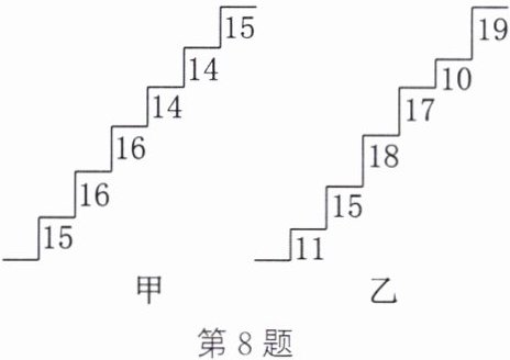 8. 在某旅游景区上山的一条小路上有一些断断续续的台阶.如图所示为其中的甲、乙两段台阶的示意图,图中的数字表示每一级台阶的高度(单位:cm).请你用所学过的统计知识(平均数、中位数、方差和极差)回答下列问题: