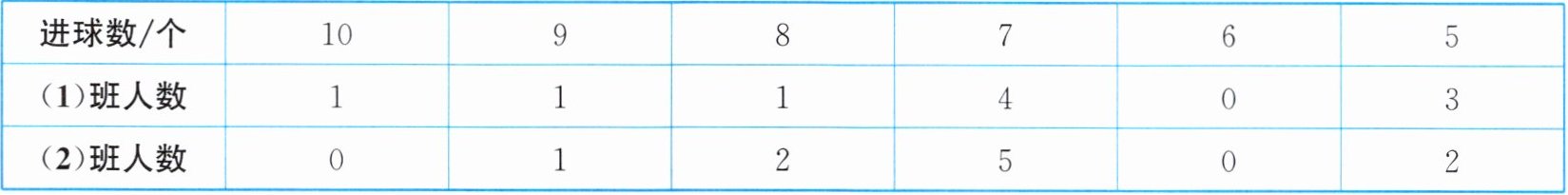 个人前三名:选择(1)班((1)班最高进球数10个,高于(2)班最高9个)。