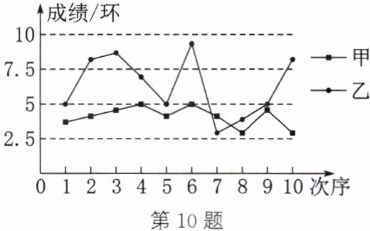 11. (2025·苏州期末)甲、乙两人在相同条件下均进行10次射击.若甲射击成绩的平均数是8环,方差是1环²;乙射击成绩的平均数是8环,方差是1.2环²,则的成绩比较稳定(填“甲”或“乙”).