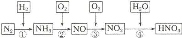 ①$N_{2}+3H_{2}\underset{\text{催化剂}}{\overset{\text{高温、高压}}{\rightleftharpoons }}2NH_{3}$ 还原 ②$4NH_{3}+5O_{2}\underset{\triangle }{\overset{\text{催化剂}}{\xlongequal{\;\;}}}4NO + 6H_{2}O$ 氧化 ③$2NO + O_{2}\xlongequal{\;\;}2NO_{2}$ 氧化 ④$3NO_{2}+H_{2}O\xlongequal{\;\;}2HNO_{3}+NO$ 氧化 还原
