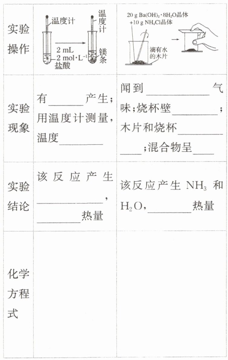 气泡 升高 刺激性 发凉 黏结在一起 糊状 气体放出 吸收 $Mg + 2HCl = MgCl_{2} + H_{2}\uparrow$ $Ba(OH)_{2}\cdot 8H_{2}O + 2NH_{4}Cl = BaCl_{2} + 2NH_{3}\uparrow + 10H_{2}O$