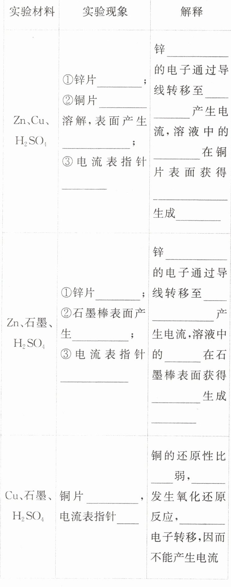 溶解 不 无色气泡 偏转 失去 铜片表面 H⁺ 电子 H₂ 溶解 无色气泡 偏转 失去 石墨棒表面 H⁺ 电子 H₂ 不溶解 不偏转 H₂ 不能 没有