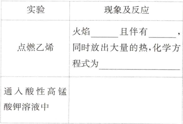 明亮 黑烟 C₂H₄ + 3O₂$\xrightarrow{点燃}$2CO₂ + 2H₂O 酸性高锰酸钾溶液褪色