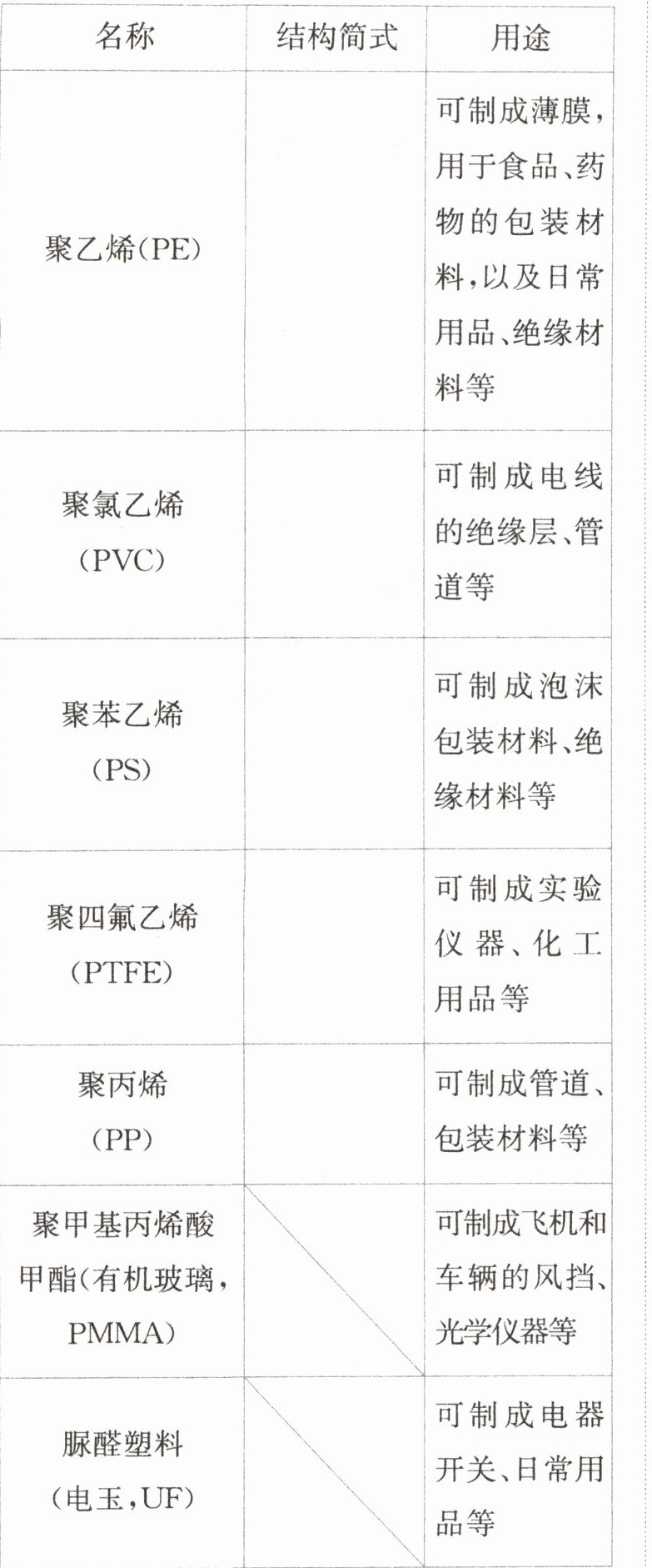 (1)①合成树脂 增塑剂 防老剂 ②高 小 耐腐蚀 ③$\begin{array}{c}[CH_2 - CH_2]_n\end{array}$