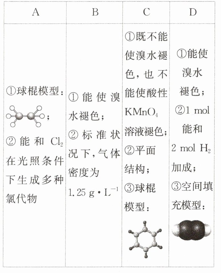 解析 根据信息及四种烃的结构,可推断烃A为乙烷($CH_3CH_3$),烃B为乙烯($CH_2 = CH_2$),烃C为苯(
