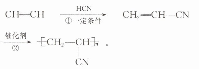 (3)根据反应流程,$CH\equiv CH$和$HCN$先发生加成反应生成$CH_2 = CHCN$,再发生加聚反应生成聚丙烯腈,故化学方程式为①$CH\equiv CH+HCN\xrightarrow{一定条件}CH_2 = CH - CN$;②$nCH_2 = CH - CN\xrightarrow{催化剂}\begin{array}{c}[CH_2 - CH]_n\\\vert\\CN\end{array}$。