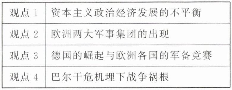 C 解析:根据表中信息并结合所学知识可知,政治、经济、军事等因素的共同作用导致了第一次世界大战的爆发,C项正确;A、B、D三项解读不全面,排除。故选C。