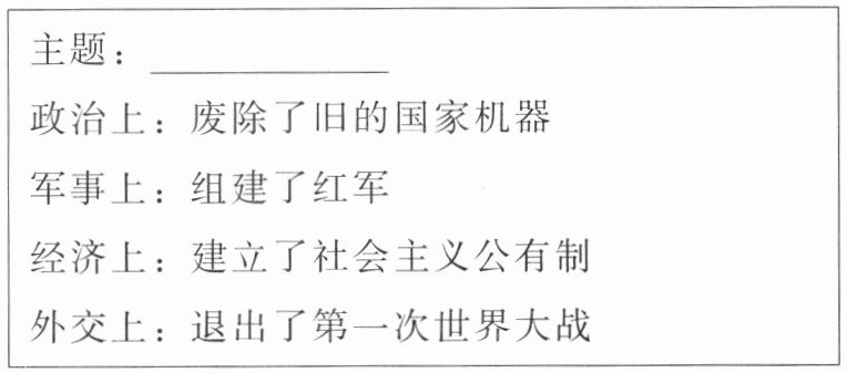 B 解析:根据所学知识可知,表格中的措施是1917年十月革命后建立的苏维埃政权采取的一系列措施,所以,主题应是苏维埃政权的建设,B项正确;俄国二月革命后建立的是资产阶级临时政府,材料中的措施与资产阶级临时政府无关,排除A项;实施战时共产主义政策的措施只涉及经济方面,排除C项;材料信息是彼得格勒武装起义胜利后为巩固新生苏维埃政权采取的一系列措施,排除D项。故选B。
