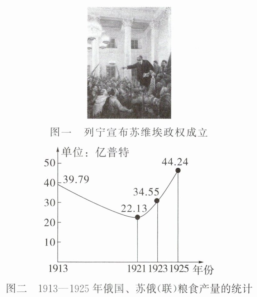 (2)根据图二,概括1913—1925年俄国、苏俄(联)粮食产量的变化趋势。结合所学知识,指出导致1921—1925年变化趋势出现的政策因素。