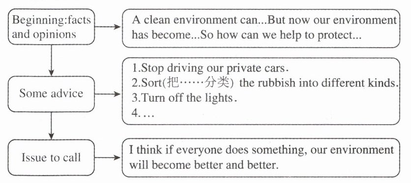 First, we can stop driving our private cars. We can go to school or work on foot or by bus. It not only can protect the environment, but also is good for our health. Second, we are supposed to sort the rubbish into different kinds because some can be reused or recycled. Third, we should turn off the lights when leaving a room. What’s more, stop littering! It’s necessary to put things you don’t need in the bin.