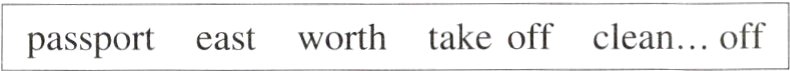 1. worth 2. take off 3. passport 4. clean; off 5. eastern