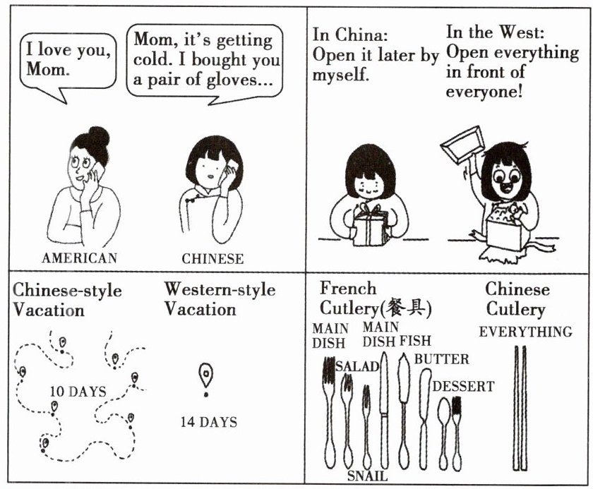 2 A 推理判断题。根据第一幅漫画中的文字提示可推知,西方人会用直接的方式表达爱。其他三个选项均与图文信息不符。
