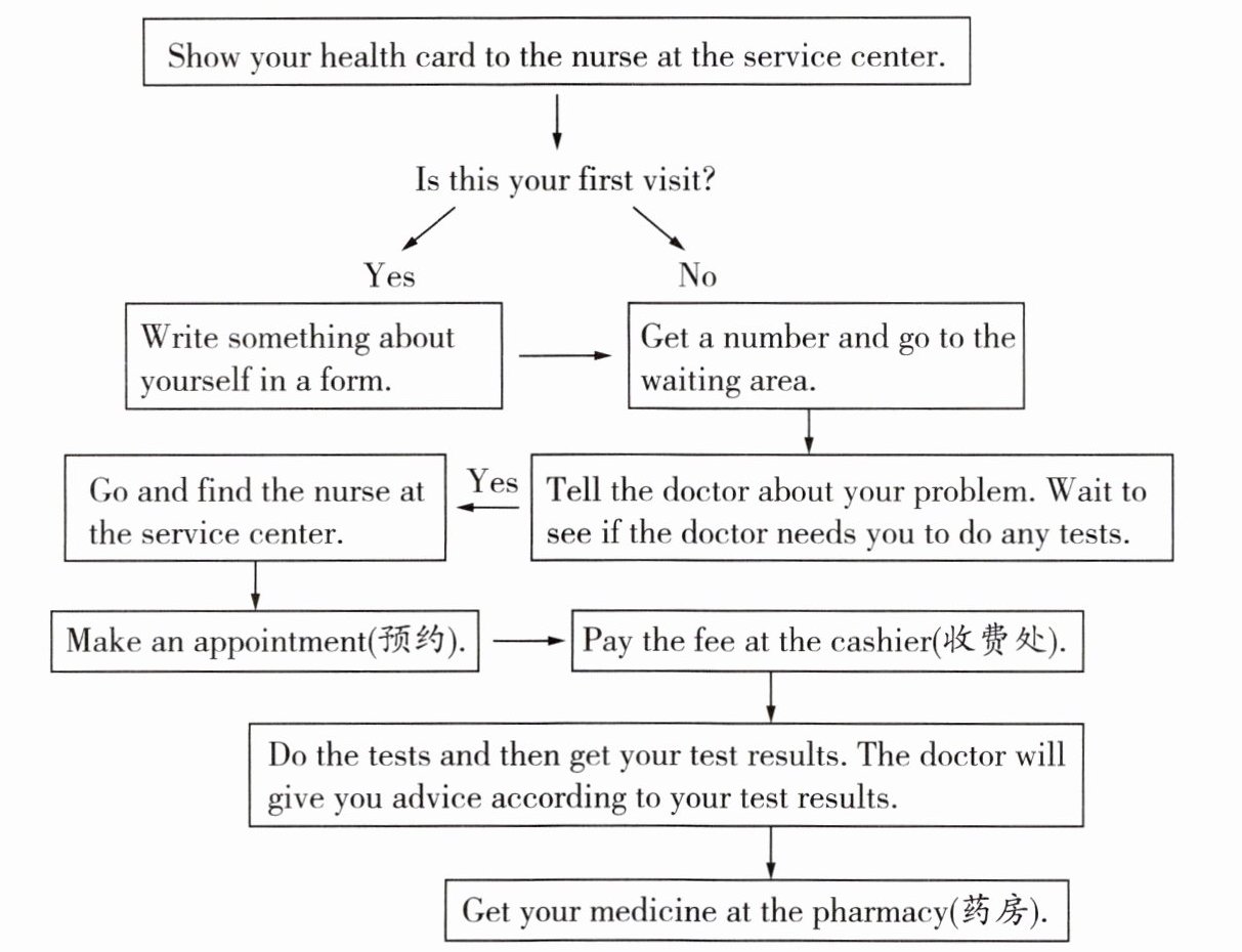 2 B 细节理解题。根据图中的“No”和“Get a number and go to the waiting area”可知,如果不是第一次去,可先直接取号,然后在等候区等待医生叫号即可。