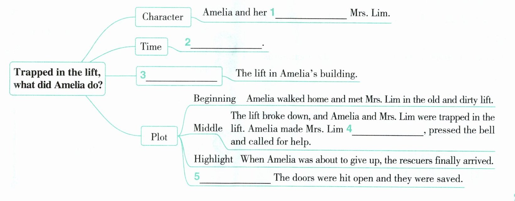 Mrs. Lim was terribly afraid. "We will never get out!" she cried with her face pale. Amelia pressed the bell in the lift immediately. Then she tried her very best to make Mrs. Lim calm down.