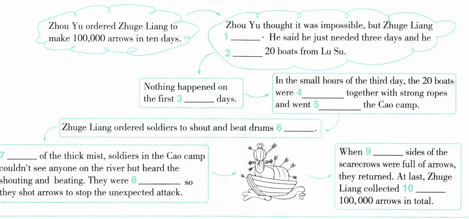 One day, Zhou Yu ordered Zhuge Liang to make 100,000 arrows in ten days on purpose. Zhou Yu thought it was impossible, but Zhuge Liang said, “Give me three days.” Then he asked Lu Su to lend him 20 boats, and the soldiers put some scarecrows(稻草人) in line on the boats. He reminded Lu Su not to tell Zhou Yu what was happening.