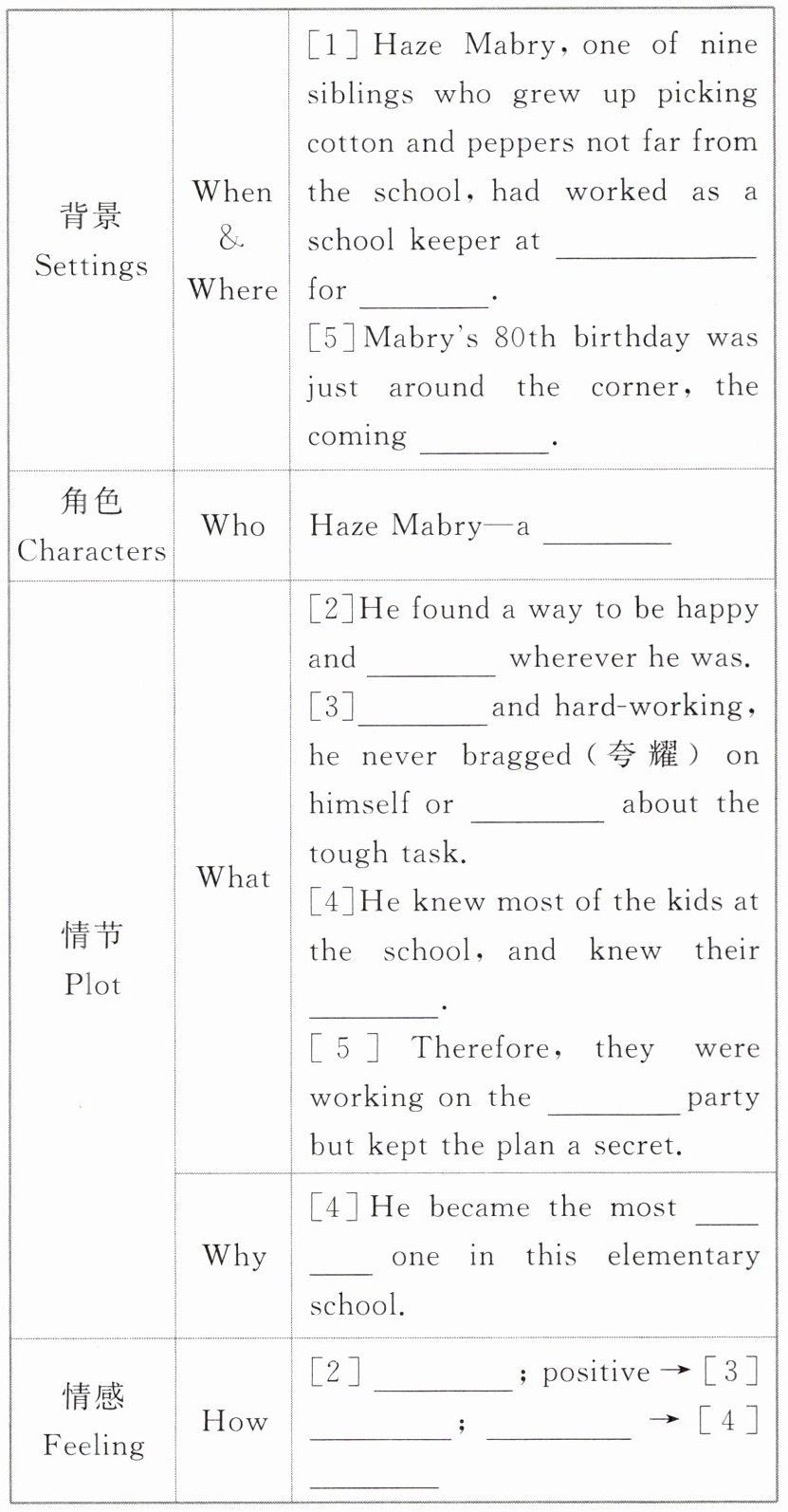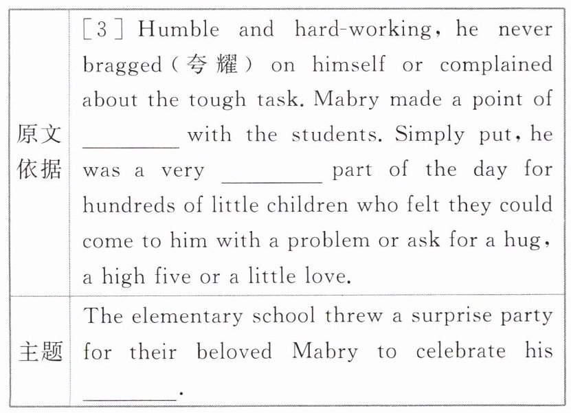 ① 根据第一段的段首句可知,周二晚上 5 点 35 分,马布里(Mabry)下班回家。第一段应描写:大家为第二天庆祝马布里的 做准备。首先应该 学校;其次,大家手写生日贺卡,表达对马布里的 与尊重;最后,摆放好 。