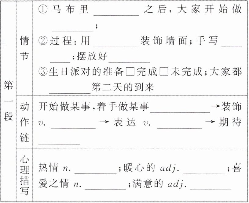 ③ 由此可推断第一段的结局:生日派对的准备 □ 完成 □ 未完成;大家都 ________________________ 第二天的到来。第二段的结局:马布里非常 ________________________,这个出乎意料的 ________________________ 记录了大家的 ________________________ 与关心,给每个人留下了深刻的印象。