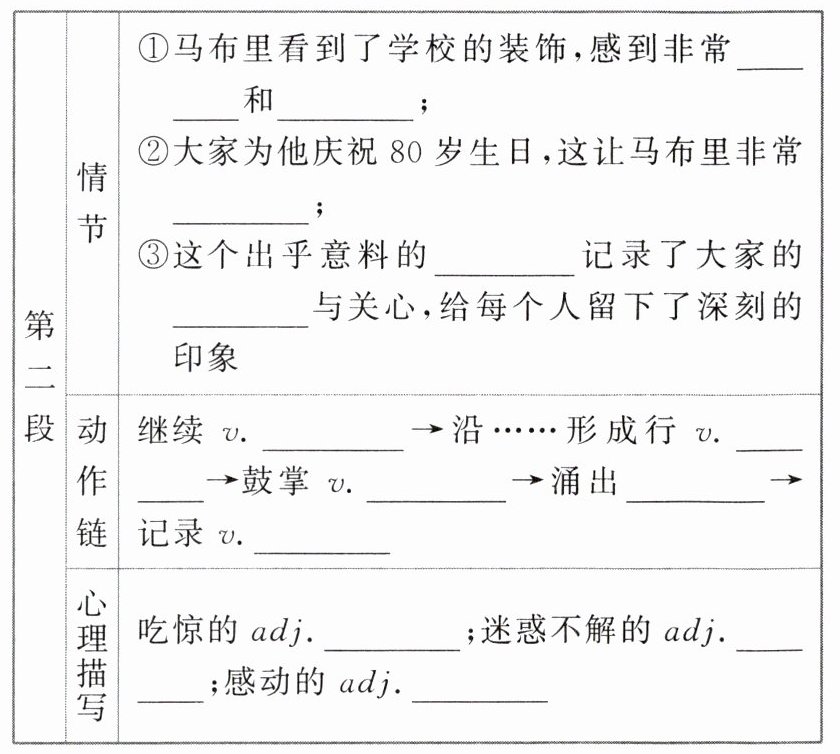 (二)①生日;装饰;爱;生日蛋糕 ②学校;生日;吃惊;迷惑;生日歌 ③√ 完成;期待;感动;生日派对;爱
