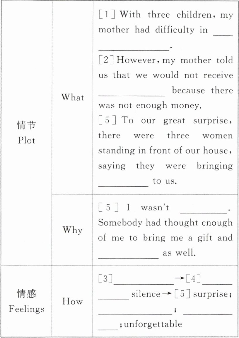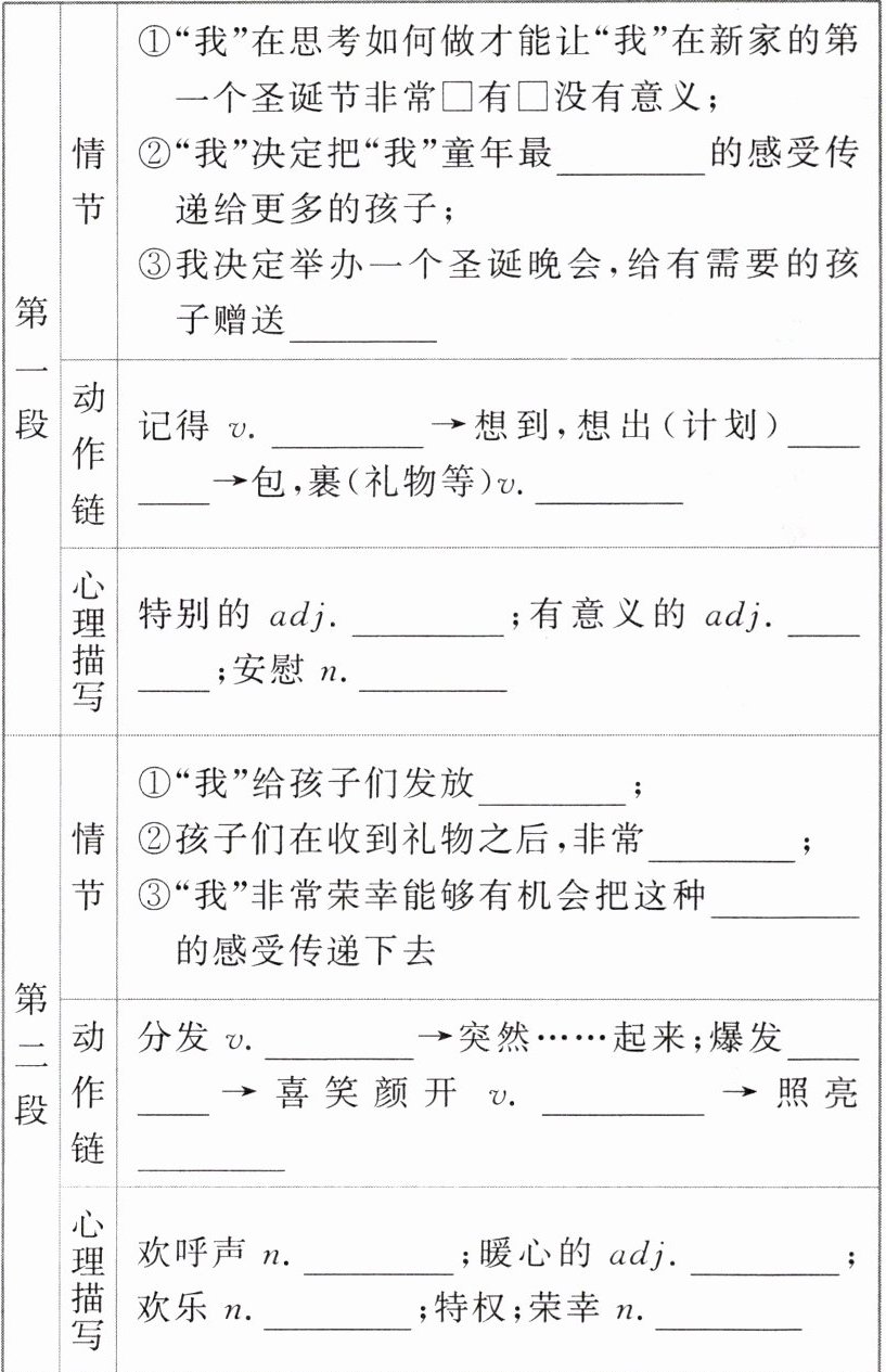 ③ 由此可推测第一段的结局:“我”准备圣诞晚会,并提前为 ________ 准备礼物。第二段的结局:孩子们在收到礼物之后,非常 □ 开心 □ 伤心。“我”非常荣幸能够有机会把这种 ________ 的感受传递下去。