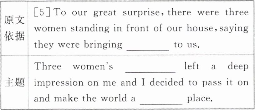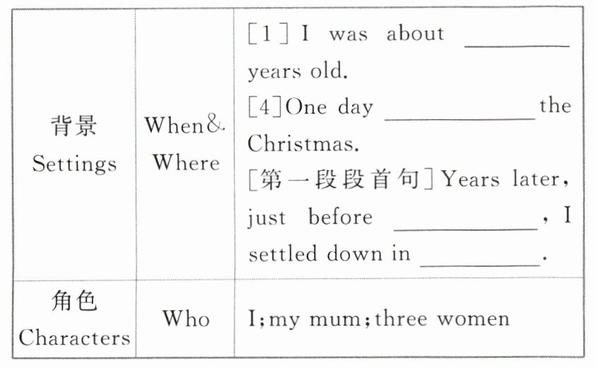 ① 根据第一段的段首句可知,几年之后,圣诞节前,“我”在新的城市 ________ 下来。圣诞节对“我”而言有 □ 普通 □ 特殊的意义。第一段应描写:“我”要将圣诞善行在新的城市 ________ 下去。
