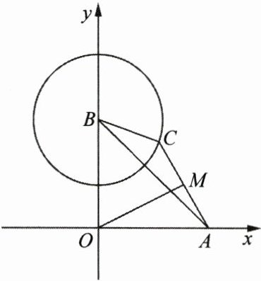 首先,我们明确题目给出的条件:等腰直角三角形$ABO$中,$OA=OB=4$,以点B为圆心,2为半径作圆,C为圆上的任意一点,连接AC,点M为线段AC的中点,连接OM。我们的目标是求出OM的最小值。
