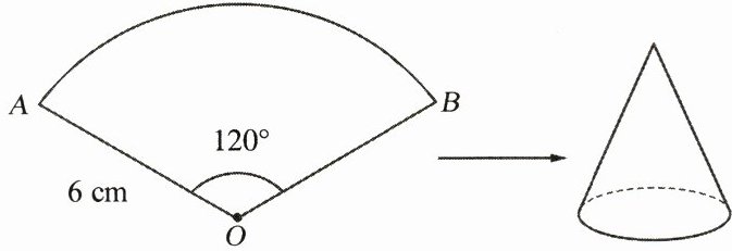 7. 如图,已知扇形 $ AOB $ 的半径为 $ 6 \text{ cm} $,圆心角的度数为 $ 120^{\circ} $,若将此扇形围成一个圆锥,则