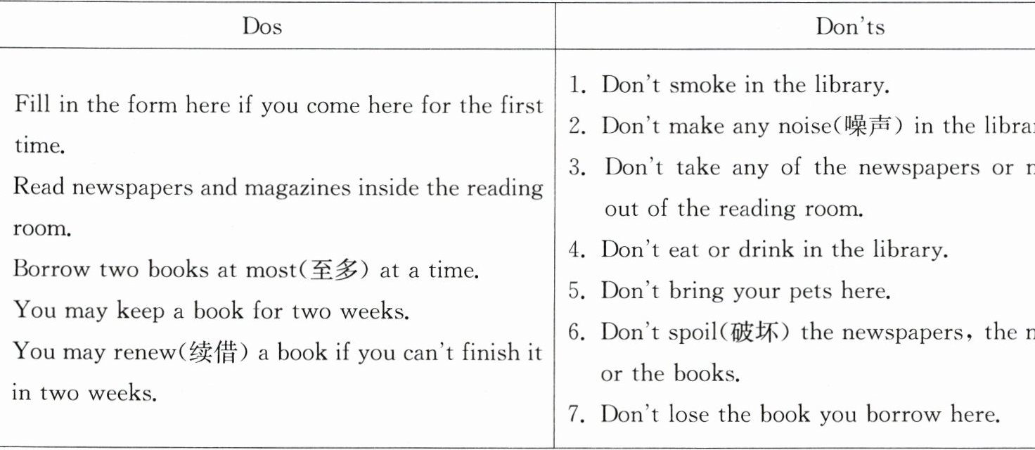 )5. Which is NOT right according to the material?A. You can borrow two books at most at a time. B. You should fill in the form if you come here for the first time. C. You can read newspapers and magazines outside the reading room. D. You can renew(续借) a book if you can't finish it in two weeks.
