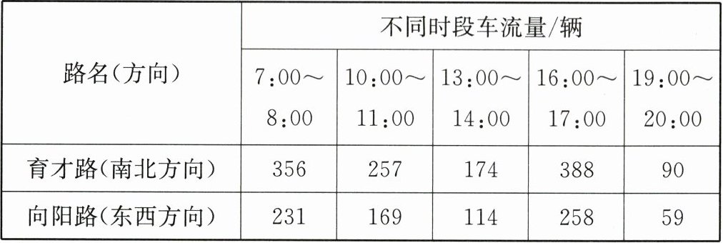 5. 某城市的育才路(南北方向)和向阳路(东西方向)相交形成一个十字路口,下面是该十字路口日常情况下某一天部分时段的车流量统计表。阅读下表,回答后面的问题。