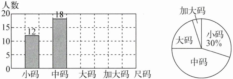 (1)$12÷30\%=40$(人)(2)穿加大码的人数:$18×(1-\frac{8}{9})=2$(人)穿大码的人数:$40-(12+18+2)=8$(人)