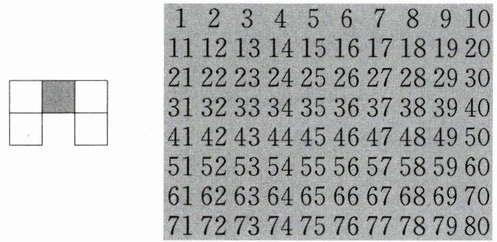 10. 用下面左边的形状在右边数表中任意框出 5 个数,连续框几次,找一找其中的规律。