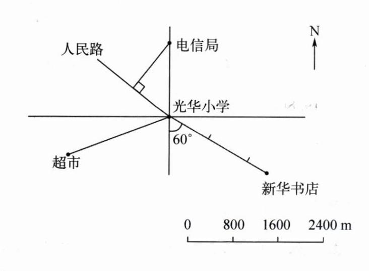 3. 新华书店在光华小学南偏东 60°方向 2 千米,图上距离应是( )厘米,在图上表示出新华书店的位置。(2 分)