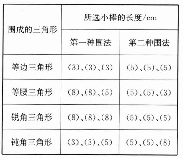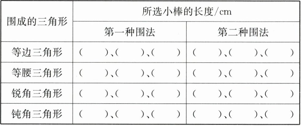 4. 从下面的9根小棒中任选3根,按要求围三角形,并完成下面的表格。(6分)