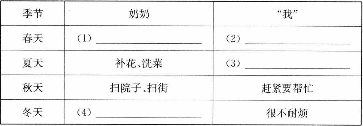1. 短文讲述了老海棠树下奶奶和“我”的故事,请将表格内容补充完整。(6分)