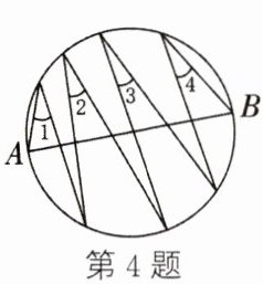 4. (整体思想)(2024·连云港)如图,AB是圆的直径,∠1、∠2、∠3、∠4的顶点均在AB上方的圆弧上,∠1、∠4的一边分别经过点A、B,则∠1 + ∠2 + ∠3 + ∠4 =