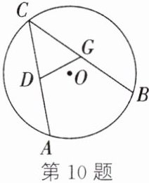 10. $ \sqrt{2} $ 解析:连接 $ AO $、$ BO $、$ AB $。根据圆周角定理,得 $ \angle AOB = 2 \angle C = 90^{\circ} $。在 $ Rt \triangle AOB $ 中,根据勾股定理,可得 $ AB = 2 \sqrt{2} $。在 $ \triangle CAB $ 中,根据三角形的中位线定理,可得 $ DG = \frac{1}{2} AB = \sqrt{2} $。