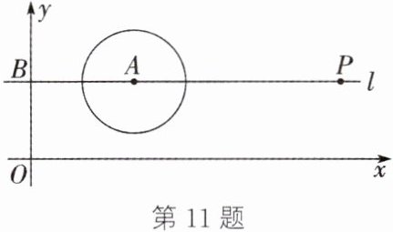 11. 如图,$O$为坐标原点,点$A$的坐标为$(4,3)$,$\odot A$的半径为$2$,过点$A$作直线$l// x$轴,交$y$轴于点$B$,点$P$在直线$l$上运动.