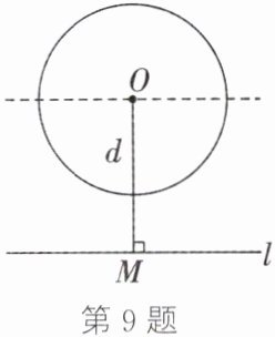 9. 如图,给定一个半径为$2$的圆,圆心$O$到水平直线$l$的距离为$d$,即$OM=d$.我们把圆上到直线$l$的距离等于$1$的点的个数记为$m$.如$d=0$时,$l$为经过圆心$O$的一条直线,此时圆上有$4$个到直线$l$的距离等于$1$的点,即$m=4$.